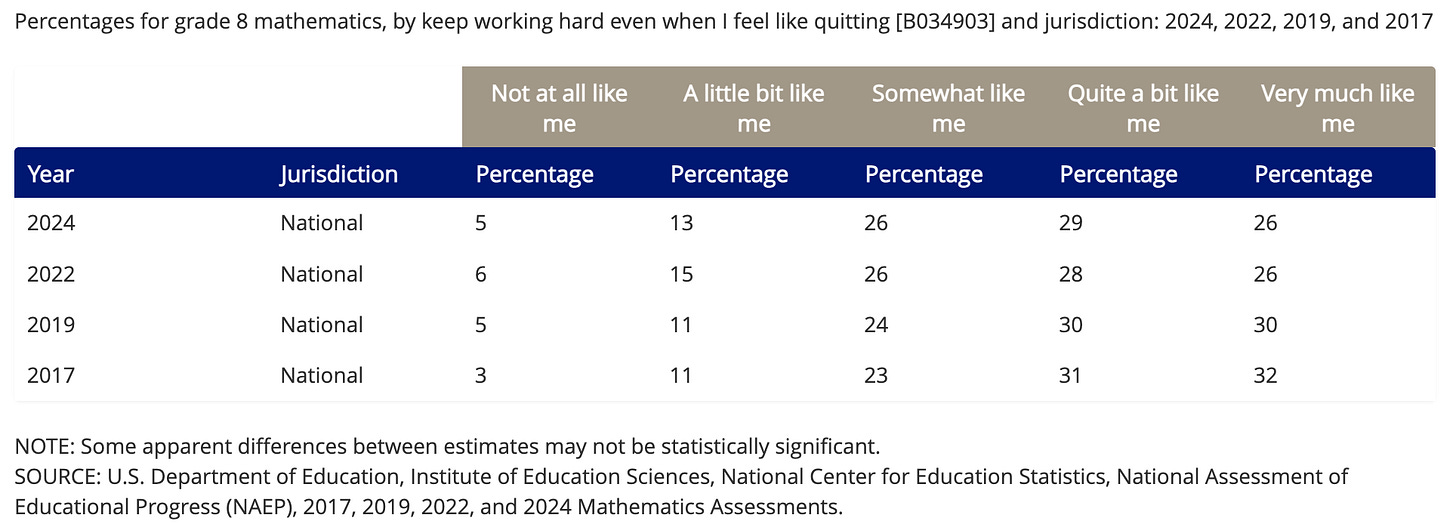 National achievement shows the damage. Since 2017, eighth graders taking NAEP math have been asked about their effort by reacting to the statement “I keep working hard even when I feel like quitting.”
