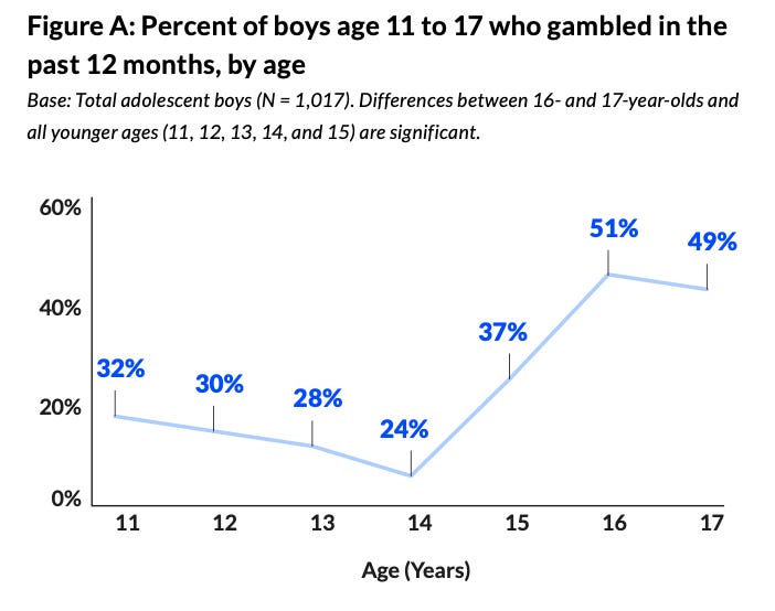 Teen gambling has become alarmingly commonplace. Half of boys aged 16-17 report gambling in the past year - more than are using alcohol, nicotine, or marijuana.