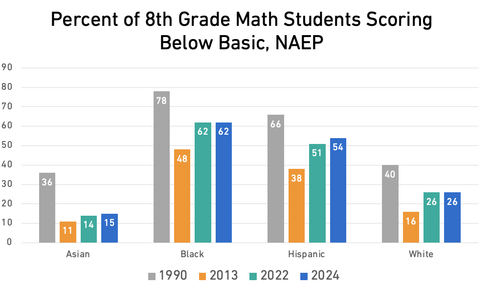 The latest scores confirm that the depression rolls on. Below is an updated version of a graph I made in the fall. For each racial group, we have just as many eighth graders scoring Below Basic as we did in 2022 and far more than we had in 2013.