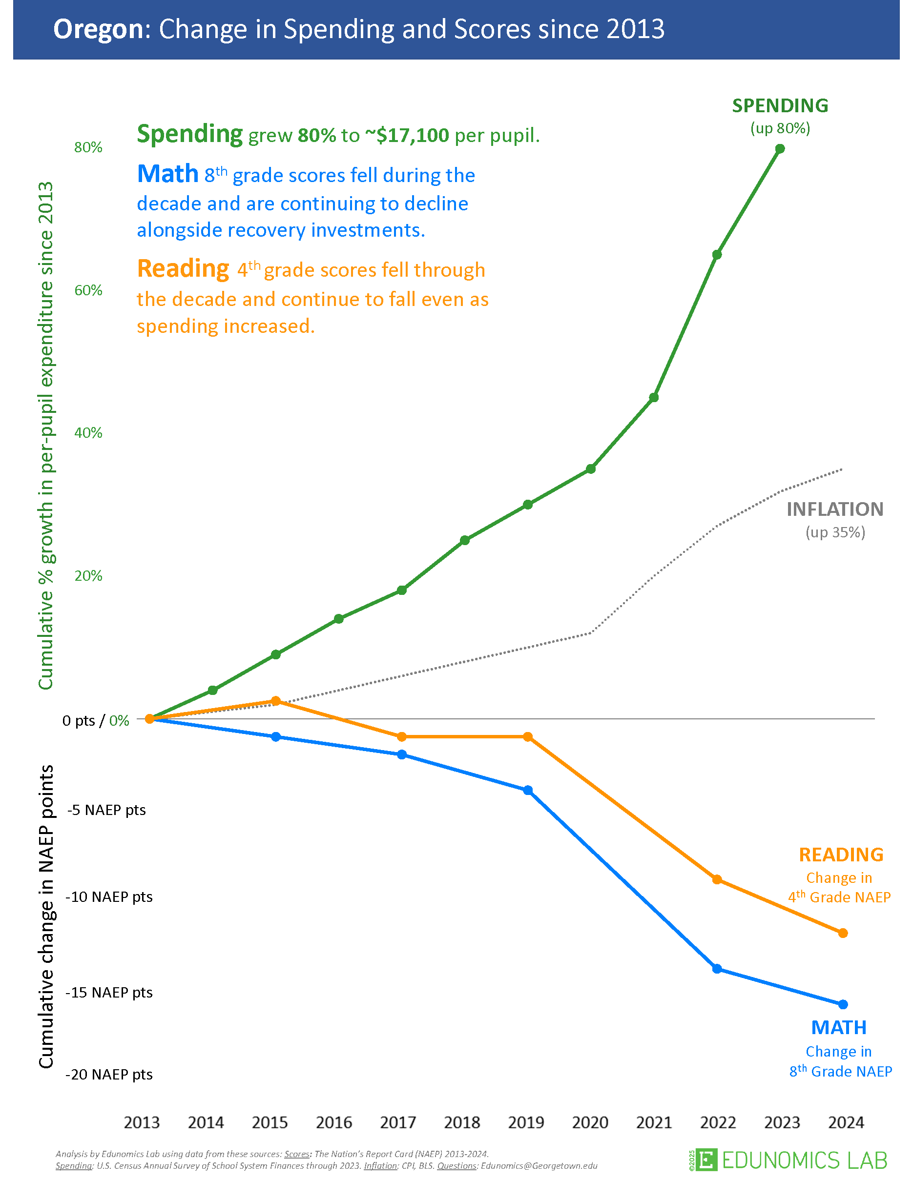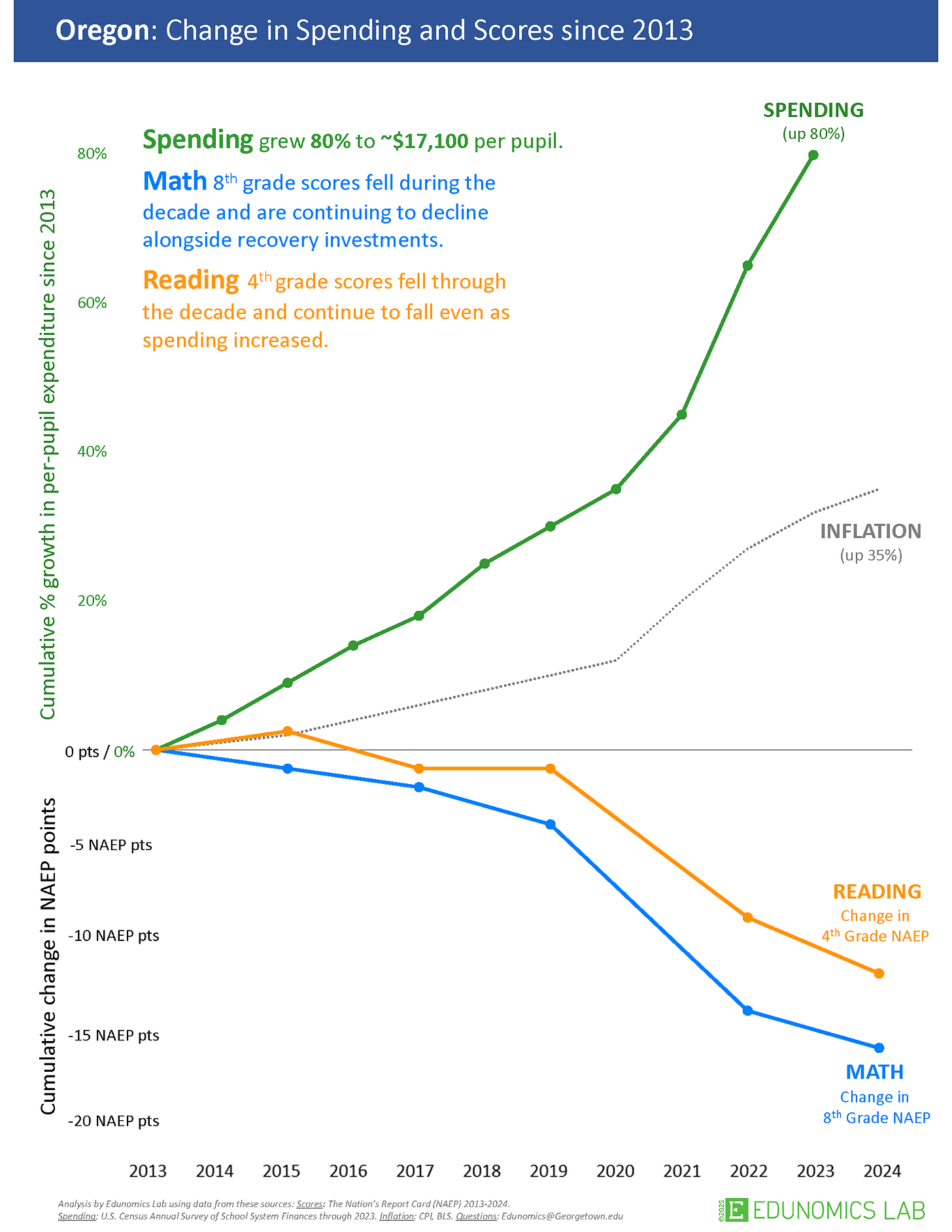 Consider Oregon. Had it merely kept pace with inflation, it would have increased school spending by about 35 percent from 2013 to 2023. In actuality, it raised spending by 80 percent. Over the same period, math and reading performance tanked, with math posting a remarkable 16-point decline - the equivalent of 1.5 grade levels. Oregon is spending much more and achieving much less.